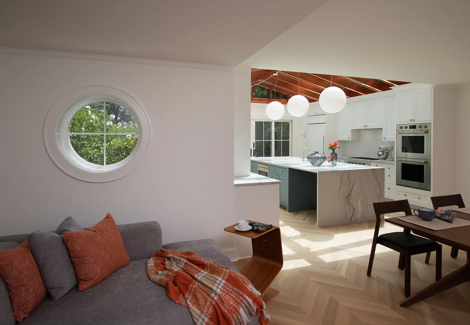 Working with Clawson Architects, the floor plans were reimagined and a more loft like open plan was designed. The former kitchen area is now a Mudroom entrance with a full bath and laundry. The former living room and dining room are now a large open family room dining area and entertaining kitchen with easy access to the patio and pool.